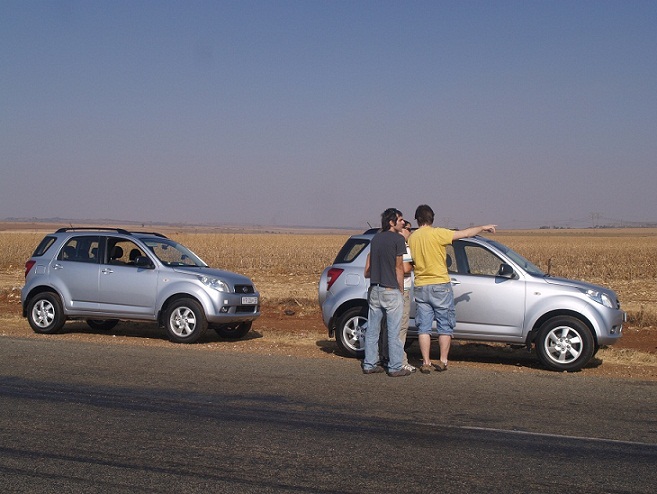 Tras un largo viaje de 15 horas en avión, con un ligero retraso en el vuelo de Madrid que nos hizo correr más de lo esperado en Londres, llegamos por fin a Johannesburgo, donde nos esperaba Tyron con nuestros coches. Dos Daihatsu Terios plateados completamente iguales, que a partir de ese momento se convierten en parte fundamental de nuestro grupo.