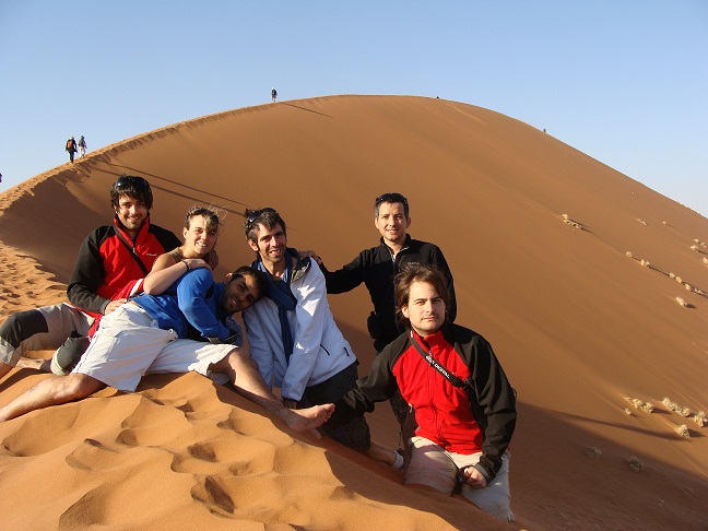 Tras aclarar el malentendido entramos en el Desierto de Namib y subimos a la duna 45, de 140 m de altura, desde donde podemos observar unas vistas de lujo de buena parte del desierto. Despúes de un rato jugando y saltando por la arena, decidimos bajar para ir al fondo del valle que dibujan las dunas y visitar la salina. Al llegar a 5km de la misma encontramos un parking y un cartel que dice: A partor de aquí solo 4x4. Como nuestros Daihatsu lo son decidimos seguir adelante, pero tras encallar dos veces en la arena y tener que empujar, regresamos al parking y le pagamos a un tipo para que nos lleve, aunque mereció la pena.