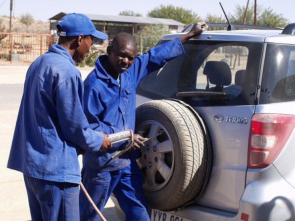Antes de salir nos damos cuenta de que una rueda está pinchada, así que toca cambiarla por segunda vez en lo que va de viaje. Partimos rumbo a Botswana gastando los pocos dólares namibios que nos quedan en gasolina y en arreglar el pinchazo.