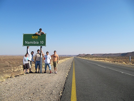 Tras levantarnos al alba para aprovechar las pocas horas de luz del invierno sudafricano, tónica diaria a partir de ese momento, y comprar algo de comida en un supermercado de la "ciudad", llegamos a la frontera con Namibia, donde comienza una gimkana que nos lleva de puesto a puesto hasta que conseguimos todos los papeles que necesitamos para salir del país. Aun queda la pertinente revisión a fondo de nuestros equipajes, salvo Ana, que se libra por no disponer en la frontera de personal femenino. La entrada a Namibia es más cómica aun, ya que no podemos pagar la tasa de entrada con tarjeta, euros o dólares, y no disponemos de la cantidad suficiente de Rands Sudafricanos. Como el cajero está estropeado, logramos cambiar lo suficiente a un grupo de americanos muy amables y entramos por fin a Namibia.