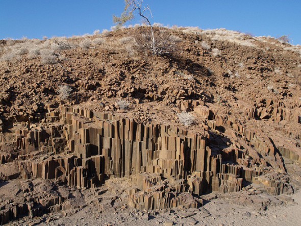 En cuanto nos alejamos de la costa para adentrarnos de nuevo en el interior del país el tiempo vuelve a cambiar, regresando al calor seco al que estábamos acostumbrados. Estamos en la zona de Damalarand, área llena de pinturas rupestres, formaciones rocosas, como la montaña quemada o el órgano, y fósiles, como el bosque petrificado, que visitamos pensando que era el oficial y resultó ser un terreno particular señalado también como Bosque Petrificado (nos dimos cuenta al pasar después por el de verdad, y por otros 5 de igual legalidad al que habíamos visto).
