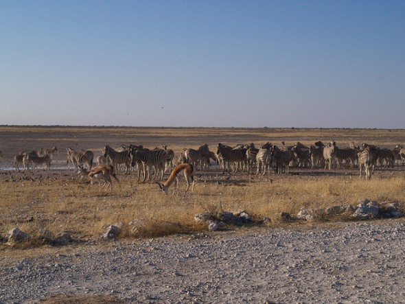 Entramos en el parque nacional de Ethosa. Por la noche, nos acercamos a una charca cercana al camping, donde se acercan a beber multitud de elefantes, jirafas, springboks, e incluso un par de rinocerontes.
