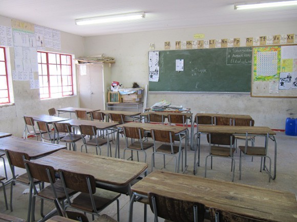 De camino paramos a ver el meteorito más grande que ha impactado con La Tierra, y que colisionó hace unos 80.000 años. Tras sacarnos unas fotos subidos al trozo de roca, formado en su mayor parte de hierro, continuamos nuestro camino deteniéndonos en un par de poblados de casas de barro. Encontramos un colegio de primaria y decidimos preguntar si podemos visitarlo. Una profesora muy amable nos enseña las instalaciones bajo la atenta mirada de un montón de chavales. Nos explica, que pese a contar con solo 15 profesores el colegio acoge a unos 500 niños de entre 6 y 16 años.